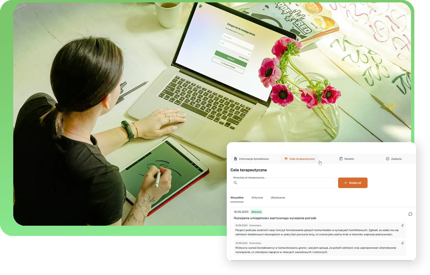 PsychoPlanner eliminuje domysły. W kilkanaście sekund widzisz pełny obraz pacjenta – cele, notatki, zadania. Wchodzisz w rozmowę pewnie, spokojnie i bez tracenia energii na szukanie szczegółów.
